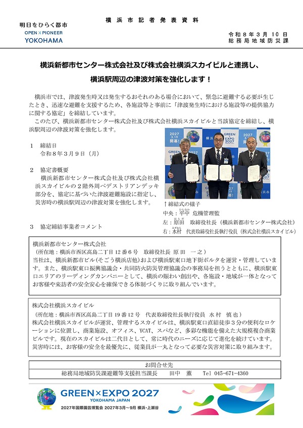 横浜駅周辺の津波対策強化に関する協定締結のお知らせ【横浜新都市センター株式会社・株式会社横浜スカイビル】